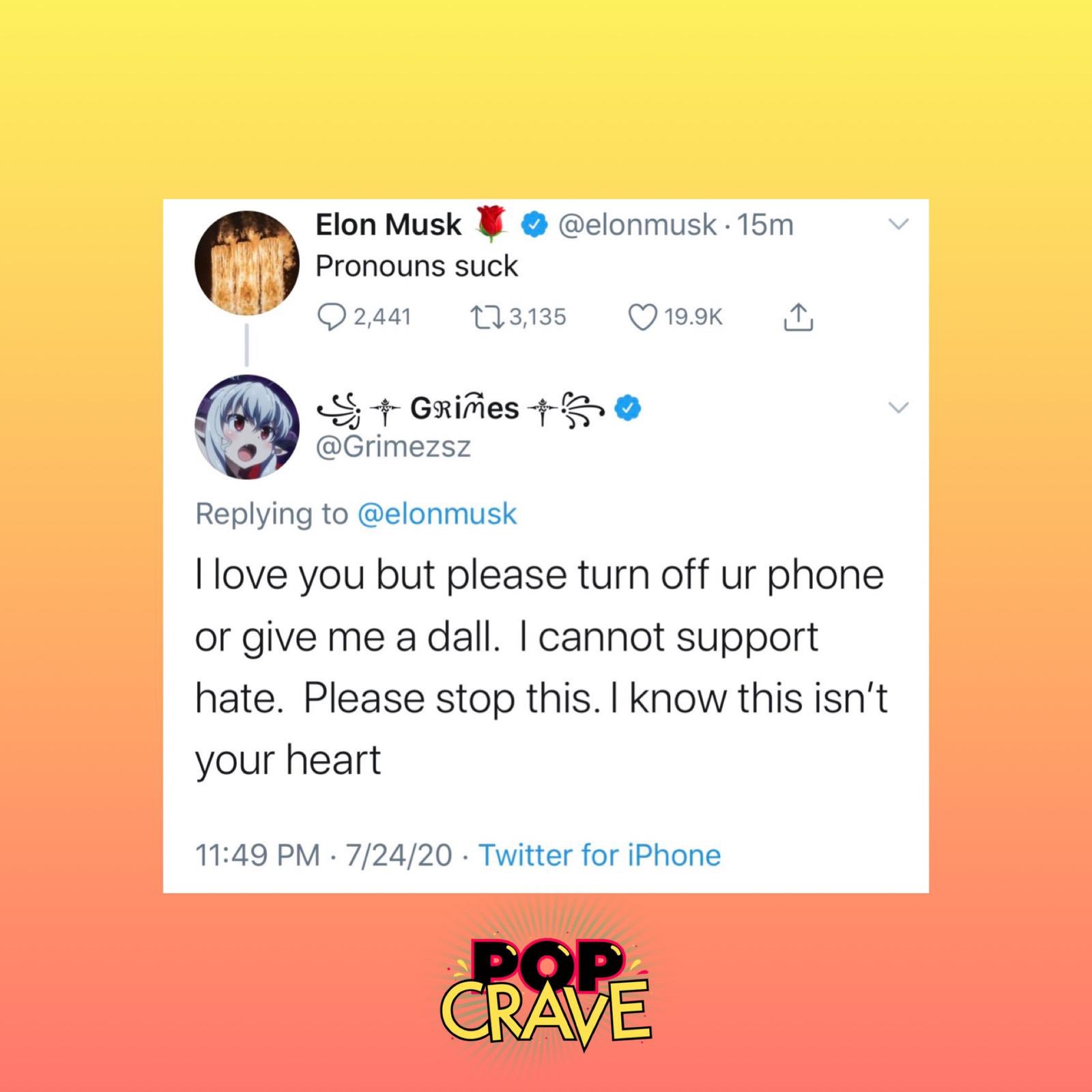 Pop Crave On Twitter Grimes Calls Out Partner Elon Musk After He Tweeted Pronouns Suck I Love You But Please Turn Off Ur Phone Or Give Me A Call I Cannot Support