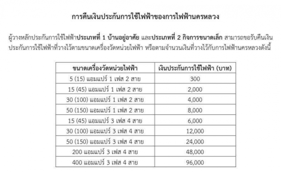 จะคนเงนประกนการใชไฟฟา ประเภทท 1 บานอยอาศย และ ประเภทท 2 กจการขนาดเลก ใหแกเจาของเงนประกนการใชไฟฟา เรมลงทะเบยนขอรบเงนตงแตวนท 25 มนาคม 2563 เปนตนไป โดยไมมกำหนดวนสนสด ซงจะเรมคนเงนตงแตวนท 31 มนาคม 2563 เปนตนไป.